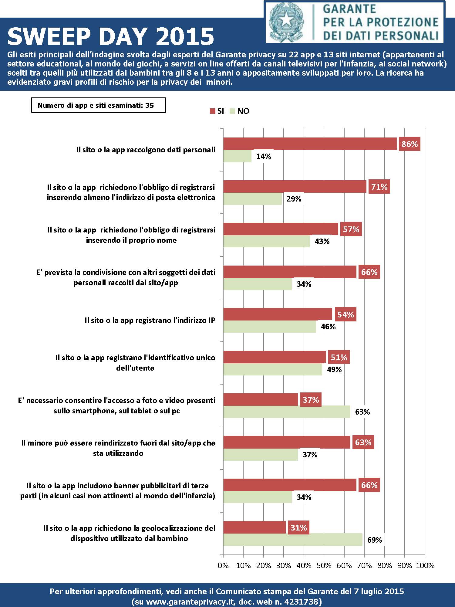 E´ emerso un panorama poco confortante, in linea con le criticità riscontrate anche dalle altre Autorità internazionali. I risultati evidenziano una grave disattenzione nei confronti dei più piccoli, poca trasparenza in merito alla raccolta, all´utilizzo dei dati personali e alle autorizzazioni richieste per scaricare le app su smartphone e tablet, presenza di pubblicità e rischi che i bambini vengano reindirizzati verso siti non controllati.