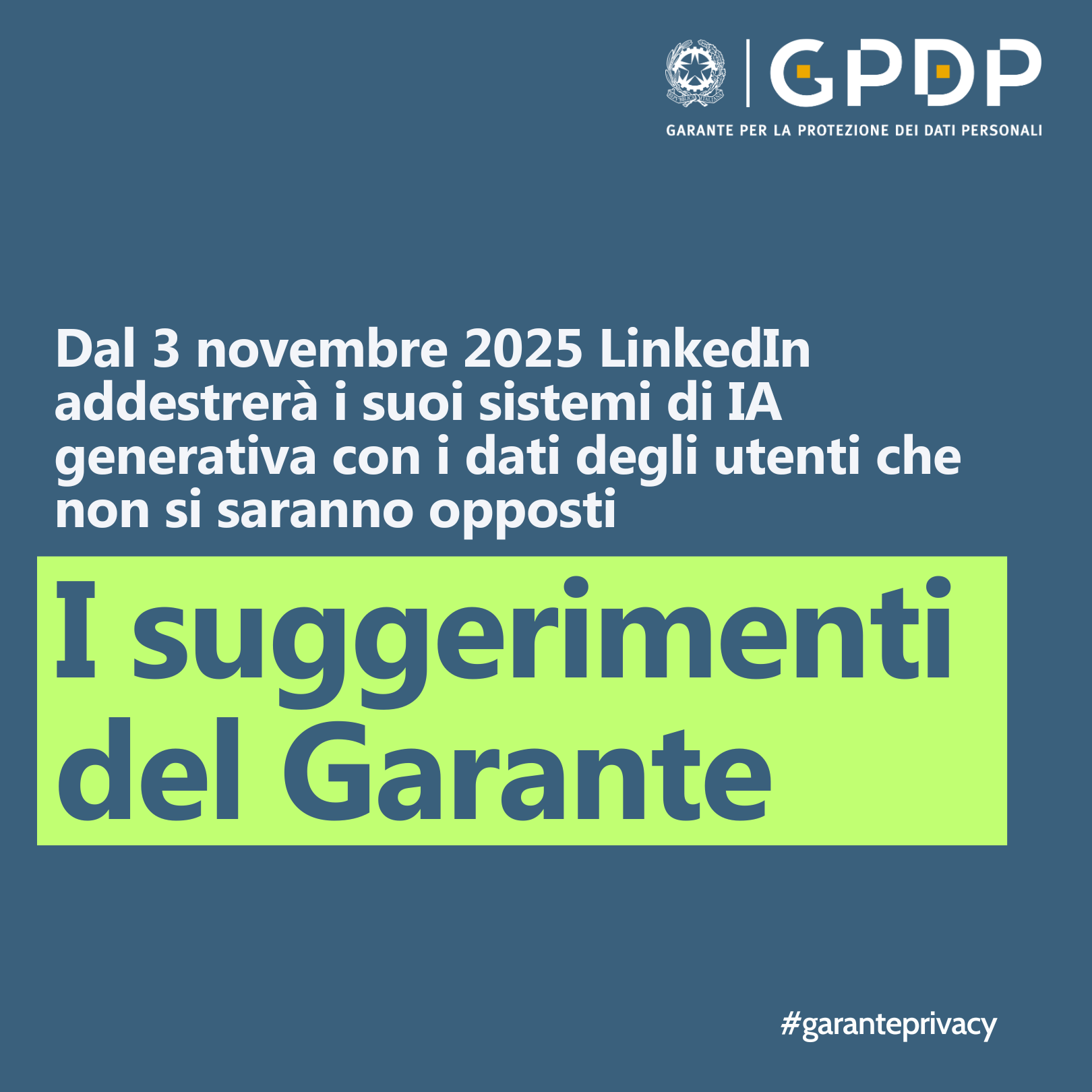 Lo afferma il Garante privacy a seguito dell’iniziativa di LinkedIn di utilizzare, dal 3 novembre 2025, i dati contenuti nei post pubblici degli utenti maggiorenni (post, commenti, didascalie, foto, ma anche dati relativi a offerte di lavoro o attività nei gruppi) per addestrare e migliorare i suoi modelli di IA generativa.